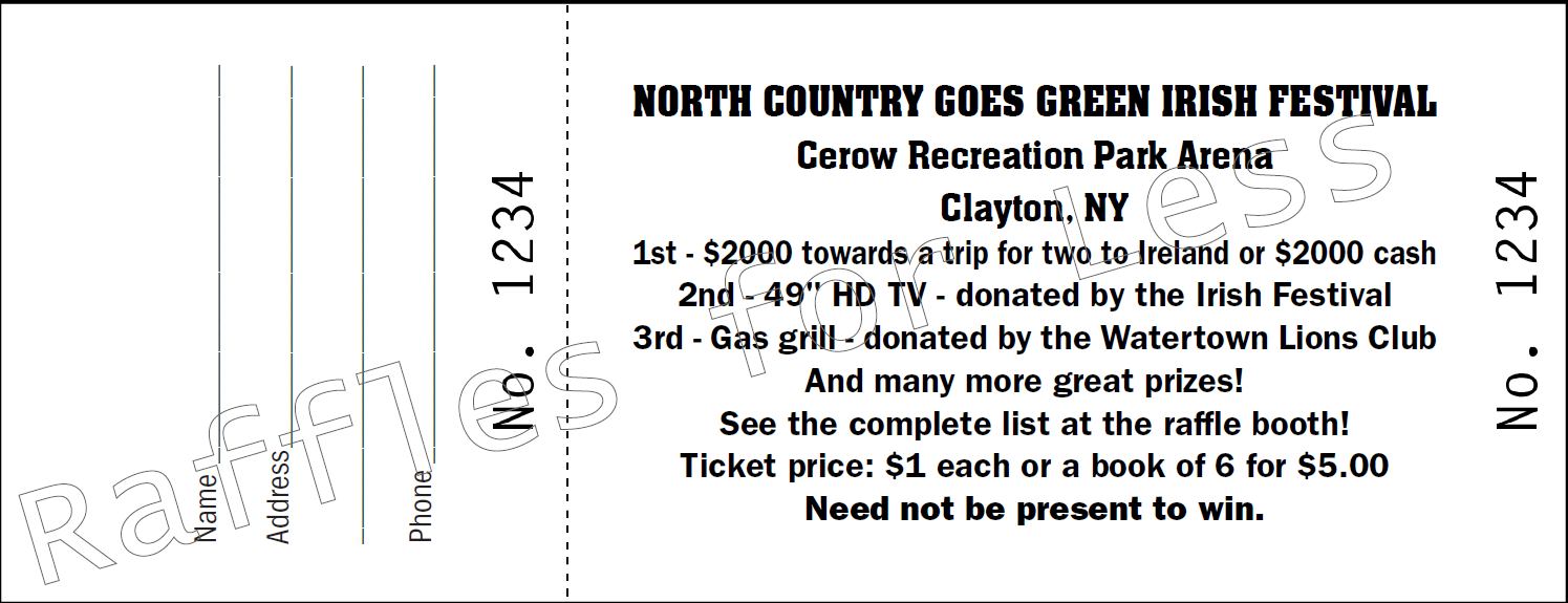 Join us for the Raffle Drawing which will be held late Saturday night just before the close of the Irish Festival!.